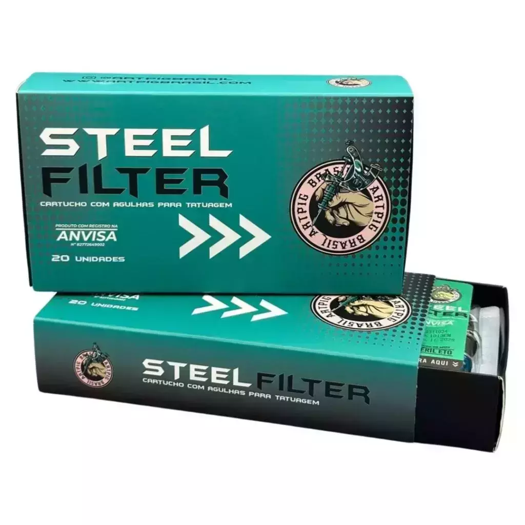 Os cartuchos STEEL FILTER da ARTPIG foram desenvolvidos com o mais alto nível de qualidade, o design do seu formato é compatível com a maioria das máquinas de encaixe universal. Sua membrana elástica é bastante flexível e extremamente resistente. Oferece uma experiência única ao tatuar com seu design anatômico. Possui um suporte de silicone para maior conforto dos dedos, a sua ponta a chanfrada diamond para um fluxo melhor de tinta, sua membrana elástica é de altíssima qualidade e é feito com aço cirúrgico 300L para garantir um fio afiado do início ao fim do procedimento. Esterilizados individualmente por gás EO.