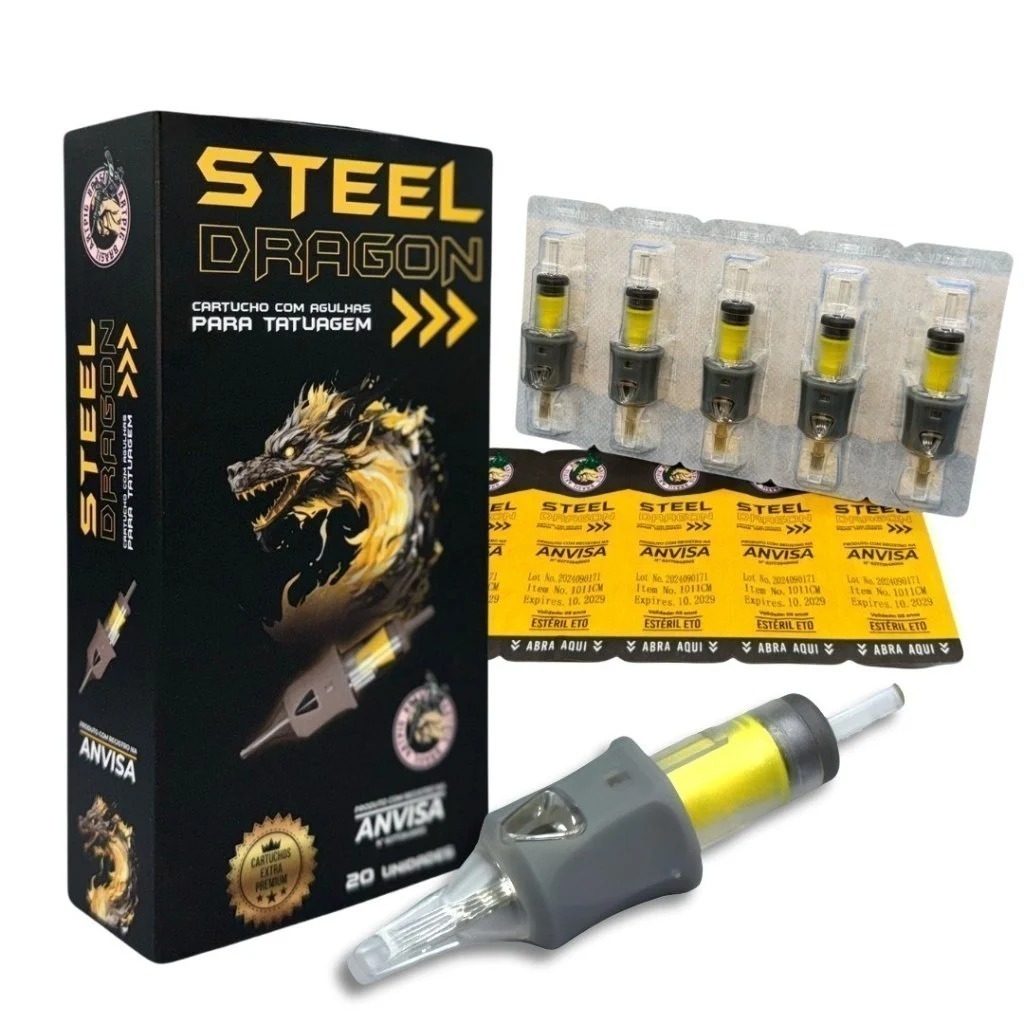 Os cartuchos STEEL Dragon da ARTPIG foram desenvolvidos com o mais alto nível de qualidade, o design do seu formato é compatível com a maioria das máquinas de encaixe universal. Sua membrana elástica é bastante flexível e extremamente resistente. Oferece uma experiência única ao tatuar com seu design anatômico. Possui um suporte de silicone para maior conforto dos dedos, a sua ponta a chanfrada diamond para um fluxo melhor de tinta, sua membrana elástica é de altíssima qualidade e é feito com aço cirúrgico 300L para garantir um fio afiado do início ao fim do procedimento.