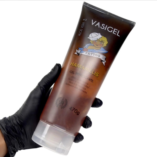 O Vasigel Hamamélis TTS (470g) é um produto desenvolvido para auxiliar tatuadores durante o procedimento de tatuagem, proporcionando maior conforto aos clientes. Este gel alivia a ardência, reduz a vermelhidão, diminui o inchaço e oferece uma sensação de refrescância natural. Pode ser usado no lugar da vaselina ao longo da tatuagem, em quantidade conforme necessidade, sendo à base de silicone hidrossolúvel e não corrosivo para luvas de látex. Recomenda-se precauções simples, como proteger a bisnaga com filme PVC para evitar contaminação e não retornar o produto à embalagem após o uso.